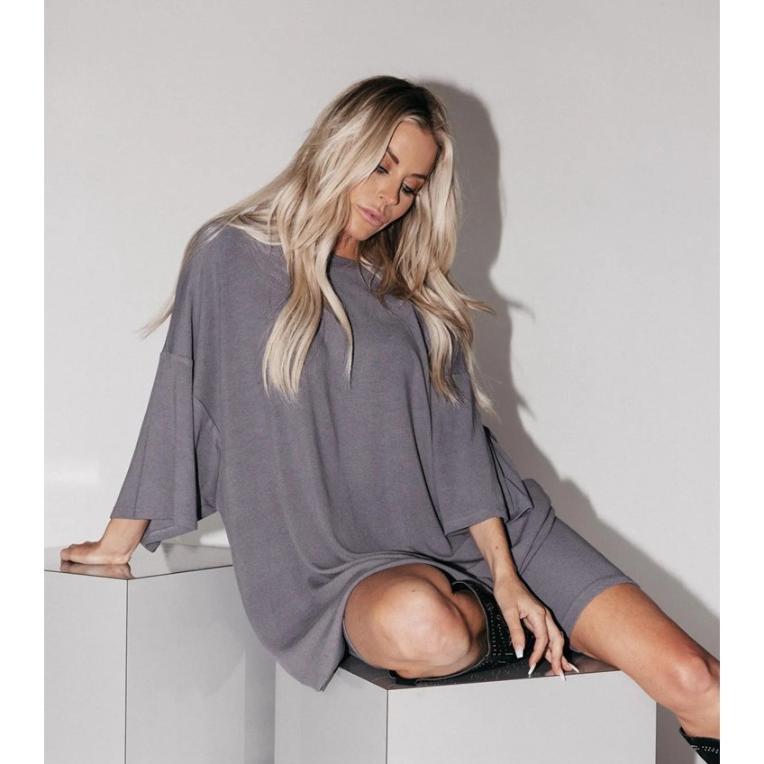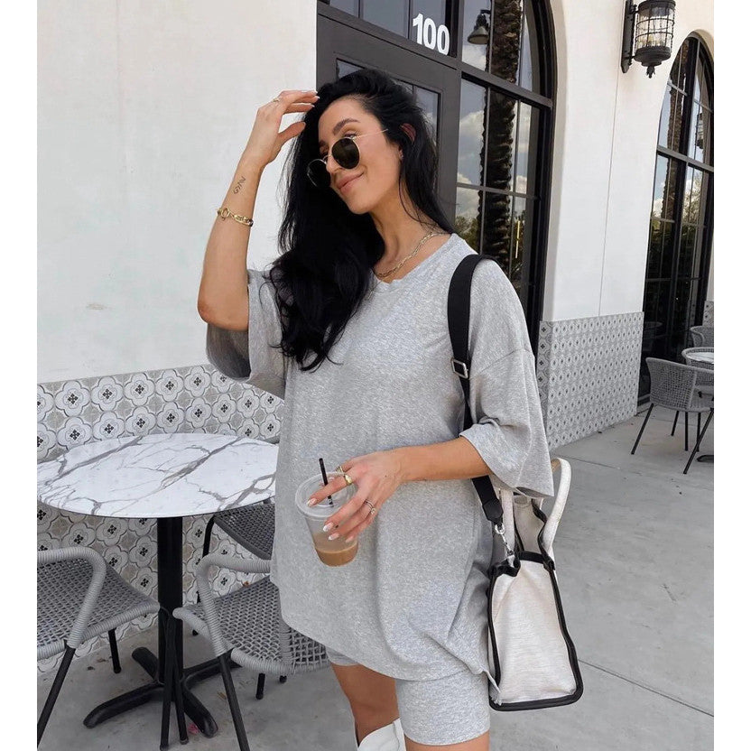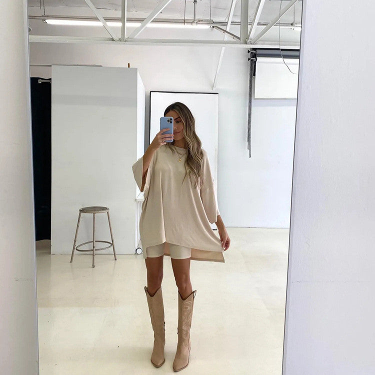 Elevate your casual wardrobe with this Round Neck Top Paired with Shorts Two-Piece Set. This chic ensemble features a high-waisted biker shorts set paired with an oversized, side-split tunic top.